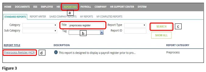 3. Click on Reporting (a) and enter Preprocess Register into the Title box (b) and Search (c). Select the Preprocess Register (HCR) report (d).