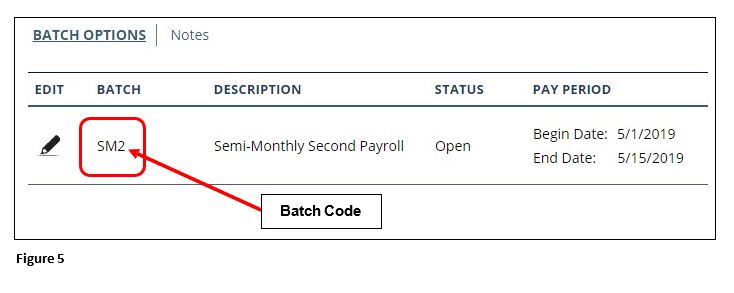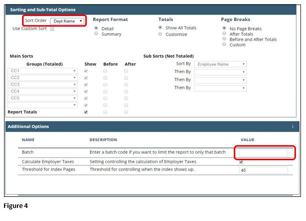 4. You don’t need to input any dates. Under Sorting and Sub-Total Options select the Sort Order you need, usually Dept Name for employees by department (Figure 4). If you only want to run it for one batch (ex. B-biweekly, W-Weekly, VM-Voids/Manual) enter the Batch code, found on the Start Tab (See Figure 5). Run the report as you would for any report and it will come up as a PDF in another tab.